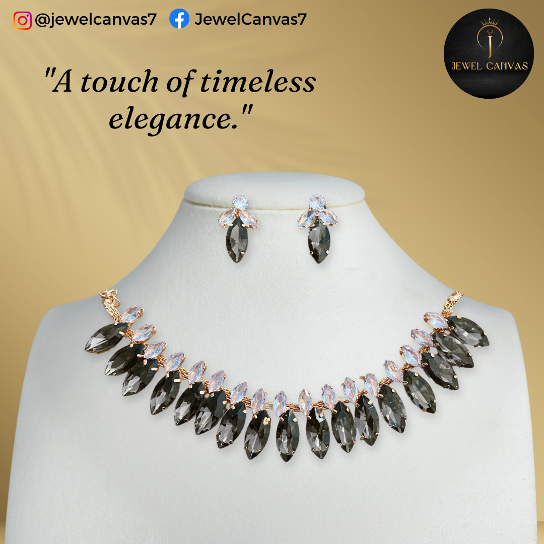 Indulge in the allure of timeless elegance with our Black Crystal Leaf Necklace Set. Featuring sleek black crystals, this set is designed to exude sophistication and class. The meticulously crafted crystals are arranged in a leaf-inspired pattern that reflects light with a captivating shimmer. Paired with matching earrings, this set effortlessly complements evening gowns and traditional attire, making it a must-have for formal events and celebrations. The gold-tone frame enhances the deep, refined look of the crystals.