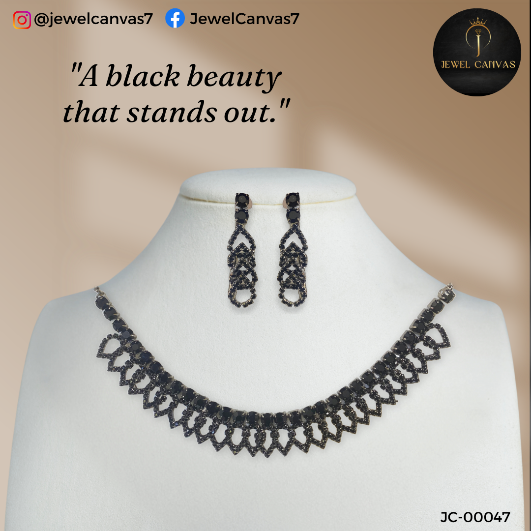 Make a bold statement with this stunning black crystal necklace and earrings set. Featuring intricately designed black crystals arranged in a captivating pattern, this set exudes sophistication and charm. Perfect for evening wear, parties, or special occasions, this set adds a touch of dramatic elegance to your ensemble. Crafted to perfection, it’s the ideal choice for those who love to stand out.