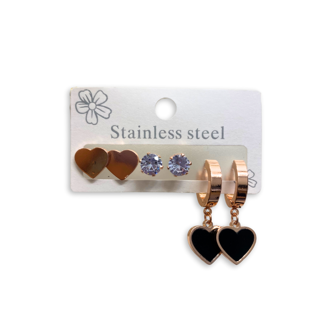Stainless Steel Heart Earring Set – Crystal Studs & Black Heart Danglers (3 Pairs)