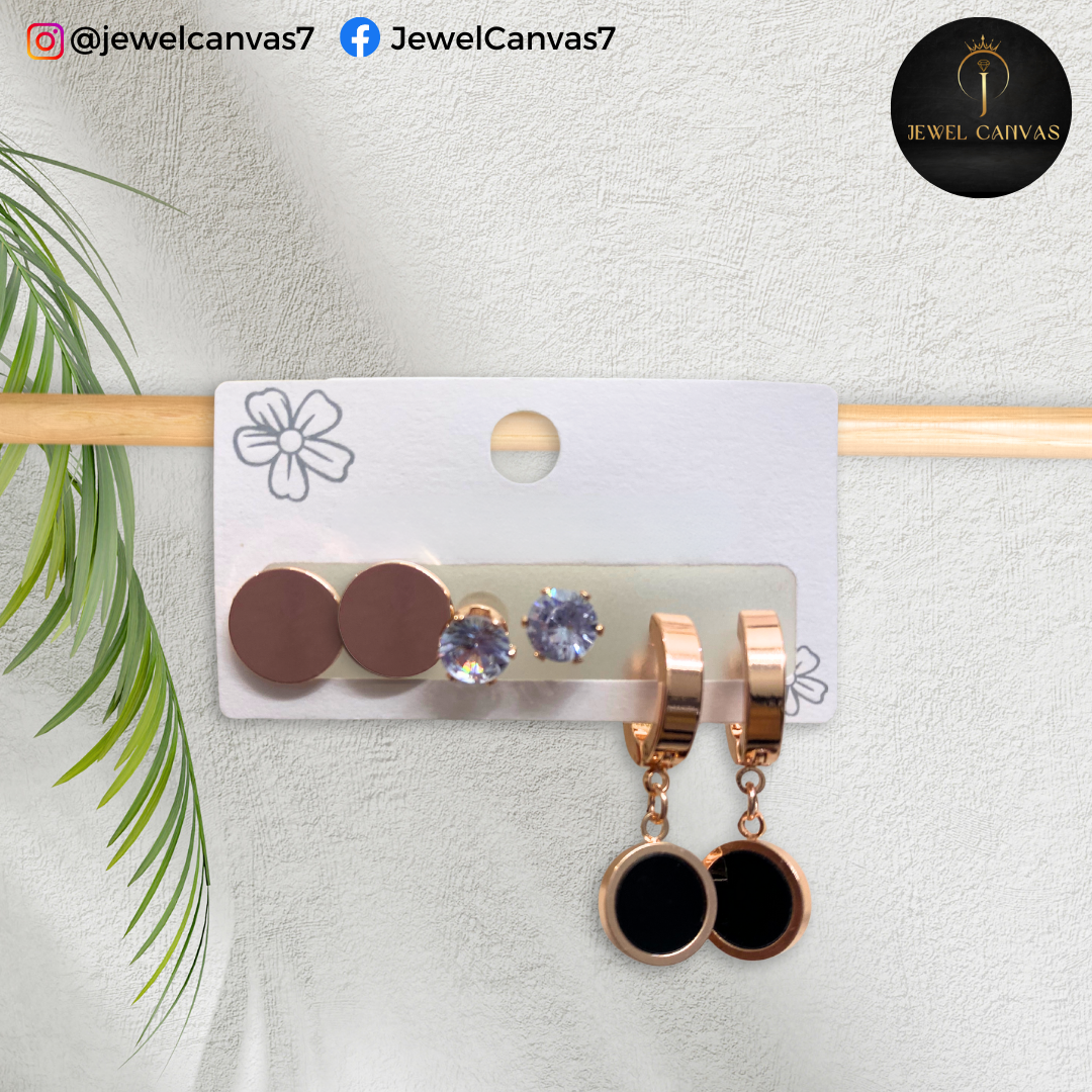 Shop 3-pair stainless steel earring set with rose gold round studs, crystal studs & black enamel danglers. Anti-tarnish, skin-safe & fashion-forward.