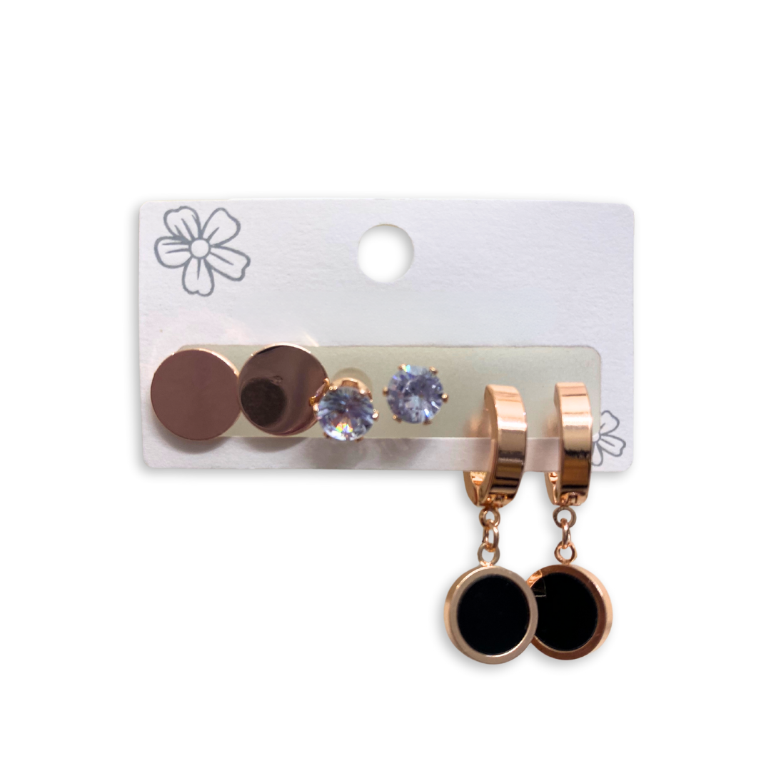 Add a modern edge to your everyday look with this 3-pair round earring set. Featuring sleek rose gold disc studs, sparkling crystal studs, and bold black round danglers, this set is crafted from premium stainless steel for durability and a long-lasting anti-tarnish finish. Perfect for styling multiple piercings or switching up your vibe.